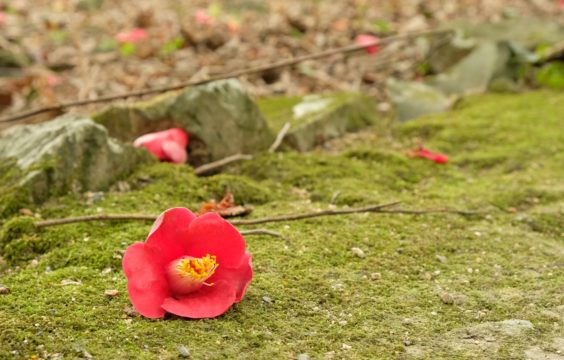 咲き終わりの椿は個々に散り行かず、開花した姿のまま落ち椿となります。樹上で鮮やかに綻んでいた椿が、地面までも彩る光景をお愉しみいただけるとともに、どこか儚さを思うものでございます。
