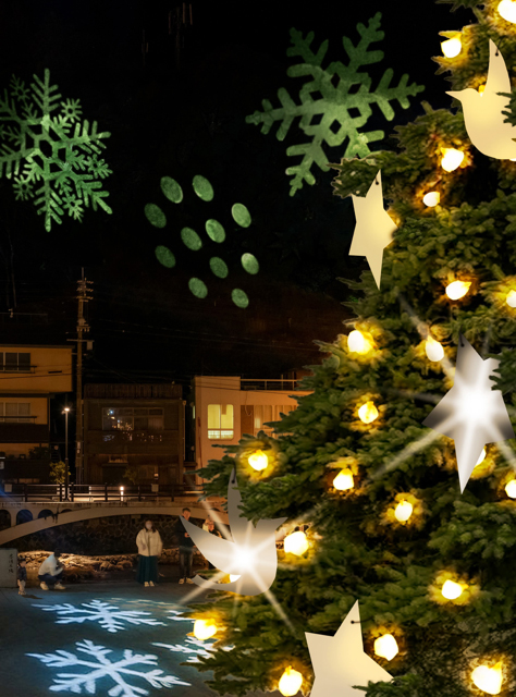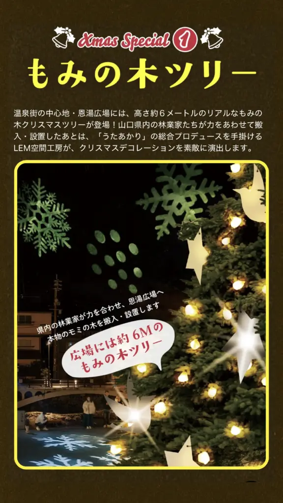 長門湯本温泉の冬の風物詩「音信川うたあかり」の第一部として、2025年より「うたあかりノエル」が開催されます。山口県産の巨大なもみの木のツリーや、星をモチーフにした光が輝くクリスマスシーズン限定の特別演出が行われ、温泉街のライトアップと相まった美しい景色をご覧いただけます。開催期間中の毎週土曜日には屋台やキッチンカーの出店も行われます。「まちの番台」ではクリスマススイーツの販売なども予定されており、この季節を一層お愉しみいただけます。2部の「音信川うたあかり」(2026年1月16日~3月8日)は長門湯本温泉内の8つのエリアで開催されます。
