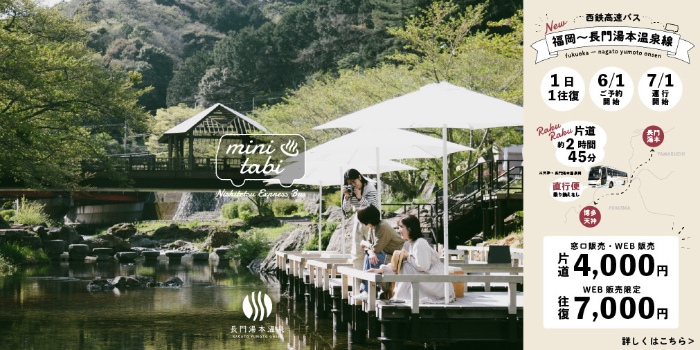 Nishitetsu Highway Bus and Bocho Highway Bus have added a new line from Fukuoka to Nagato Yumoto Onsen, and beginning July 1st, 2025, guests will be able to travel directly between these points. This will mean extremely convenient access for guests who are only considering travel via public transit from Fukuoka. Otani Sanso’s micro shuttle bus will come to pick up guests at the drop-off location in Nagato Yumoto Onsen. Please inform us in advance if you will be using this service.