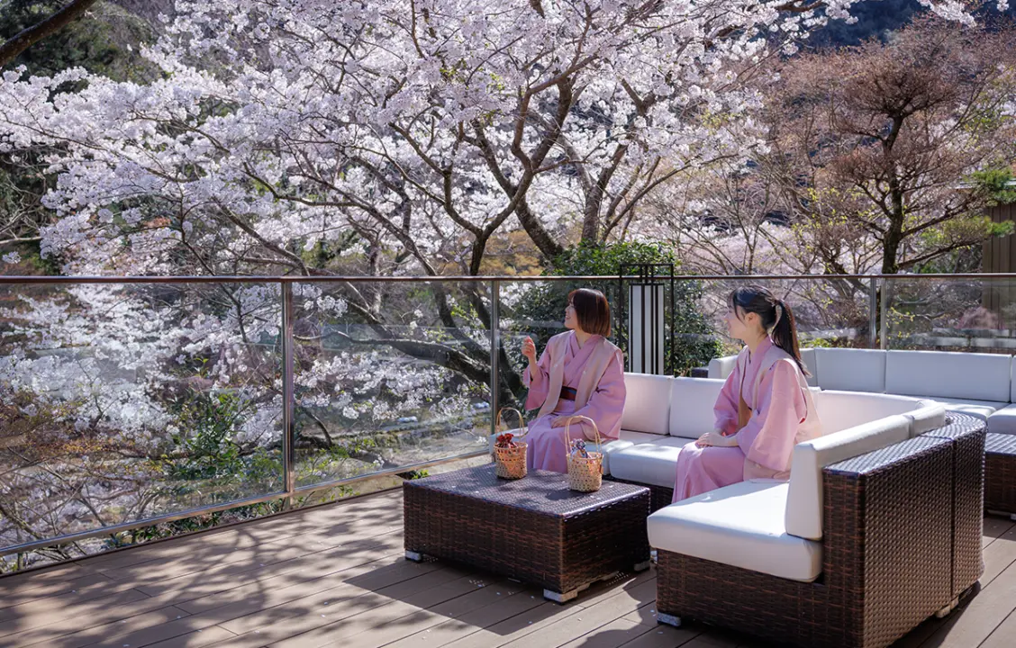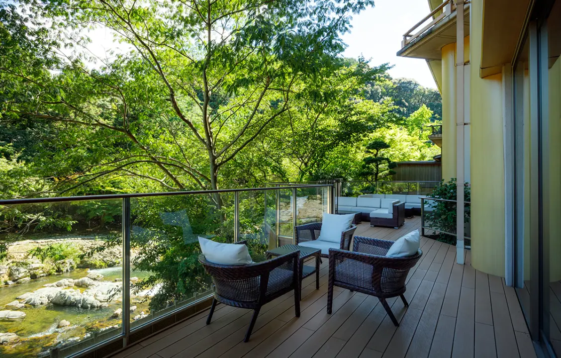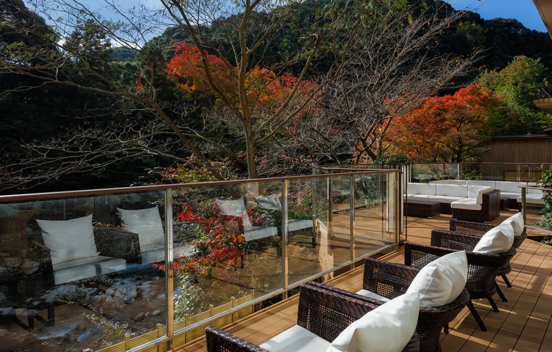 渓流の流れる水の音、小鳥のさえずり、緑の香、桜や紅葉の彩。 五感を解き放つ時間があります。湯上りのひとときにぜひご利用くださいませ。