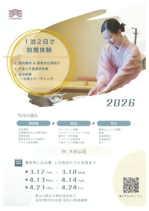 旅館・ホテルでの接客志望の方へ。大谷山荘「インターンシップ おもてなし仕事体験(1泊2日)」のご案内。