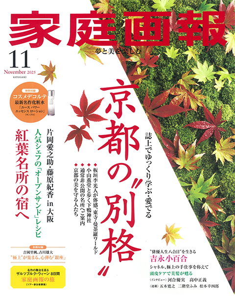 2025年10月に発行された「家庭画報 2025年11月号」の特集「紅葉名所の宿へ」で、大谷山荘が紹介されました。秋色に染まる感動の旅がテーマの当特集では、紅葉を満喫する客室や近隣に景勝地がある厳選の宿が紹介されています。大谷山荘では、紅葉を眺める渓流側の芙蓉ジュニアスイートやテラススイート、音信川沿いの紅葉に包まれる川床テラスなどが掲載されました。また、温泉街で開催中の萩焼イベント「うつわの秋」や当館から徒歩圏内の紅葉の名所・大寧寺も取り上げられております。紅に染まる長門湯本ののどかな景観を、冊子を通してお愉しみいただけますと幸いでございます。