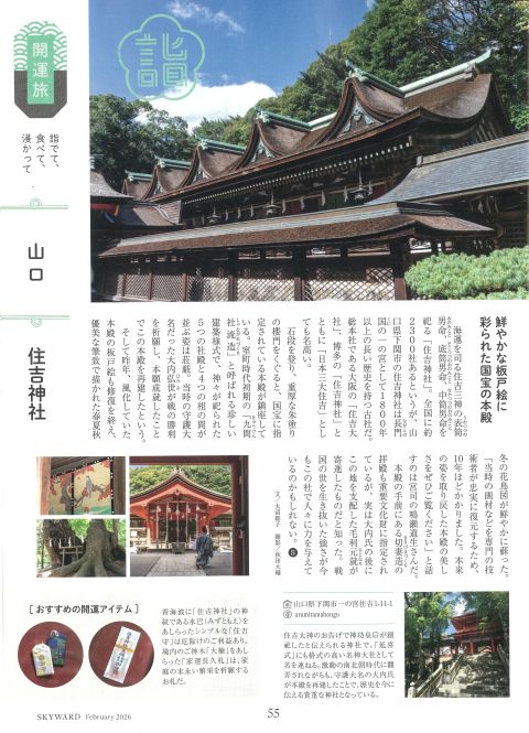 2026年2月、JALグループの機内誌「SKYWARD」にて、長門湯本温泉 恩湯と長門国一宮 住吉神社が紹介されております。こちらの雑誌では国内外の様々な情報が発信されており、2月号では特集のひとつである「開運旅 詣でて、食べて、浸かって」の中で、長門湯本温泉 恩湯、長門国一宮 住吉神社が掲載されました。