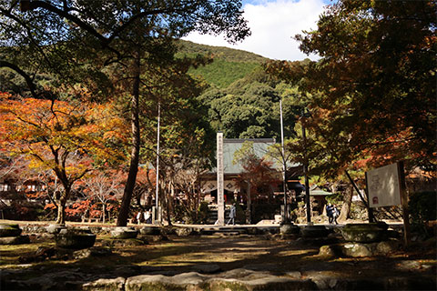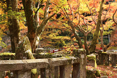 山口県の紅葉の名所「大寧寺」で、黄赤に染まる景色が広がっております。