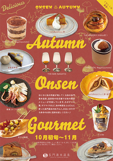長門湯本温泉の各店舗では、特色を活かした秋限定のメニューが登場。かぼちゃや栗、サツマイモなど秋の味覚を取り入れたスイーツやグルメなど、そぞろ歩きにおすすめの品々が展開されています。爽やかな気候に恵まれるこの季節に、温泉街を散策しながら、食の秋をお愉しみくださいませ。