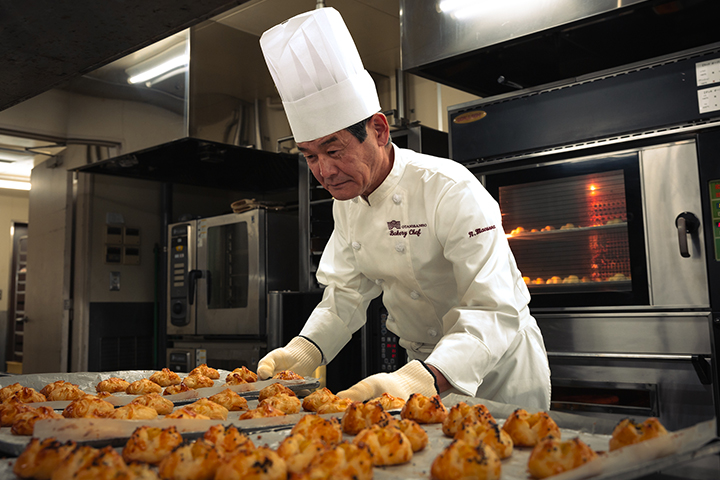 大谷山荘では、製パン技能士の国家資格を持つスタッフが、館内パン工房で小麦粉から生地を仕込み、毎朝焼き立てをお届けしています。厳選した国内製造小麦粉をじっくりと捏ね上げ、ゆっくりと時間をかけて発酵したパンはもちもちとした食感に。デニッシュやパイに欠かせないバターは国内産のポンドバターから仕込み、素材の良さを大切にしたパン作りに努めております。