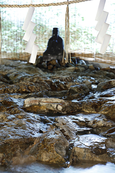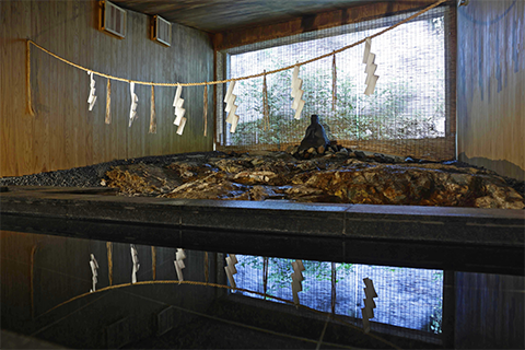 「恩湯」の泉質は、ph9.5~9.9の「アルカリ性単純温泉(ほんのり硫黄湯)」。源泉温度は39度、浴槽の温度は36~38度の「ぬる湯」です。すべすべした肌触りで、温度も体温に近いため、温泉をゆっくりとご満喫いただけます。「恩湯」は国内でも珍しい造りをしており、岩盤から自然湧出する源泉を眺めながらご入浴いただけます。岩盤と湯溜まりの間には、長門国一宮住吉神社より授けられた結界のしめ縄が張られ、湧き出る温泉が神授の湯であることを思い出させてくれます。また、もう一つの泉源として、浴槽の石底に「足元湧出泉」があり、空気に触れることなく浴槽に注がれる、究極的に鮮度の高い温泉をご堪能いただけます。生まれたての温泉の一番風呂を貸切で楽しむ贅沢を、ごゆっくりとお愉しみくださいませ。