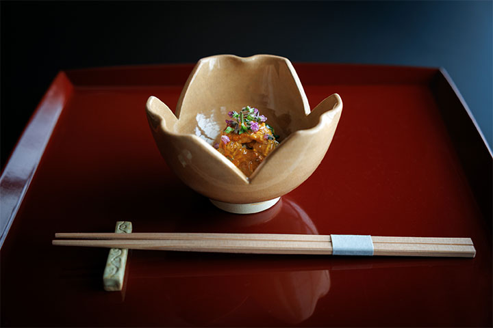 山口県を代表する伝統工芸・萩焼の窯は、毛利家の御用窯として始まり、ここ長門にも深川窯として残っております。今も受け継がれる萩焼と共に味わうのは、長門で育った山の幸、日本海で獲れる海の幸と、厳選された旬の食材にて料理長がお献立した会席料理。作家による萩焼の器に盛り付けることで、互いの技と美しさが引き立ち、また新たな魅力が生まれます。目で見て舌で愉しみながら、地元深川窯の萩焼の器で、この土地の幸を食す、長門の萩焼文化をご体験くださいませ。