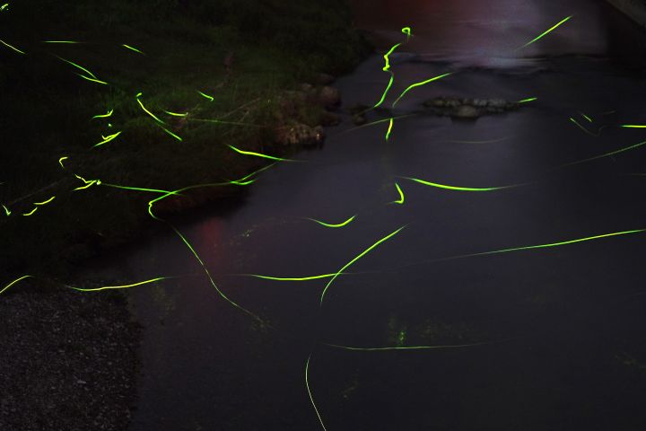 蛍には様々な種類がありますが、音信川で見られるゲンジボタルは、蛍の中でも光が強く、2~4秒ごとにゆっくりと光るのが特徴です。その光は、仲間たちとコミュニケーションを取るためと言われており、飛び回って光る蛍のほとんどがオスで、メスは草木にとまって光ります。あちらこちらで明滅する様子を見ていると、蛍たちの会話が聞こえてきそうです。蛍の乱舞は初夏の間のわずかな期間。初夏の旅の思い出づくりに出かけてみませんか?