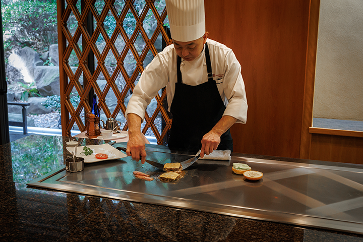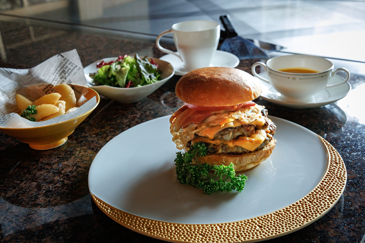 このたび、大谷山荘レストラン萩のご昼食メニューに、山口県産和牛を味わう「鉄板グリルバーガー」が加わりました。鉄板焼ディナーコースで日頃腕を磨く鉄板焼シェフが、ランチで上質なご当地バーガーのおもてなしをいたします。厳選された山口県産の黒毛和牛をじっくりとお愉しみいただきたく粗びきで仕上げられたパテは、贅沢にダブルで使用。ステーキのような肉々しさを感じるバーガーを目指しました。バンズはもちろん、当館THE BAKERYの自家製パンで仕立てております。間にはトマトやレタスなど新鮮な野菜、目玉焼きにチーズと、具材も華やかに高く組み上げ、様々な食感と味わいをお愉しみいただけます。数量限定のご提供ではございますが、山口の旅のお食事に、山口県産和牛を味わうバーガーをご賞味くださいませ。