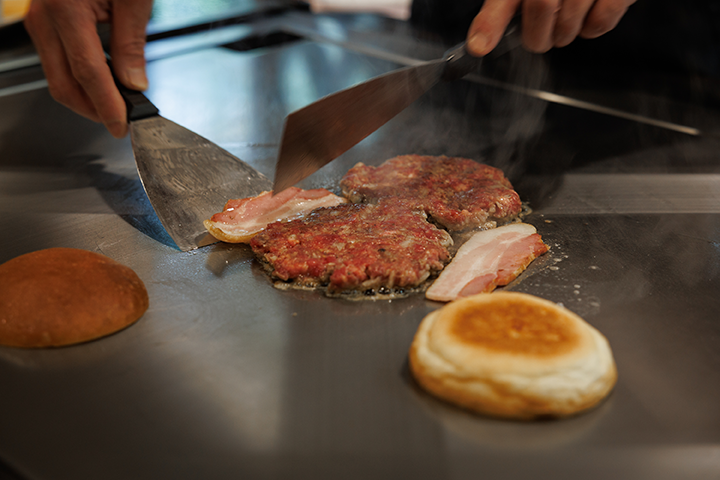 肉厚のパテは鉄板で焼き上げ、旨味を引き出しております。