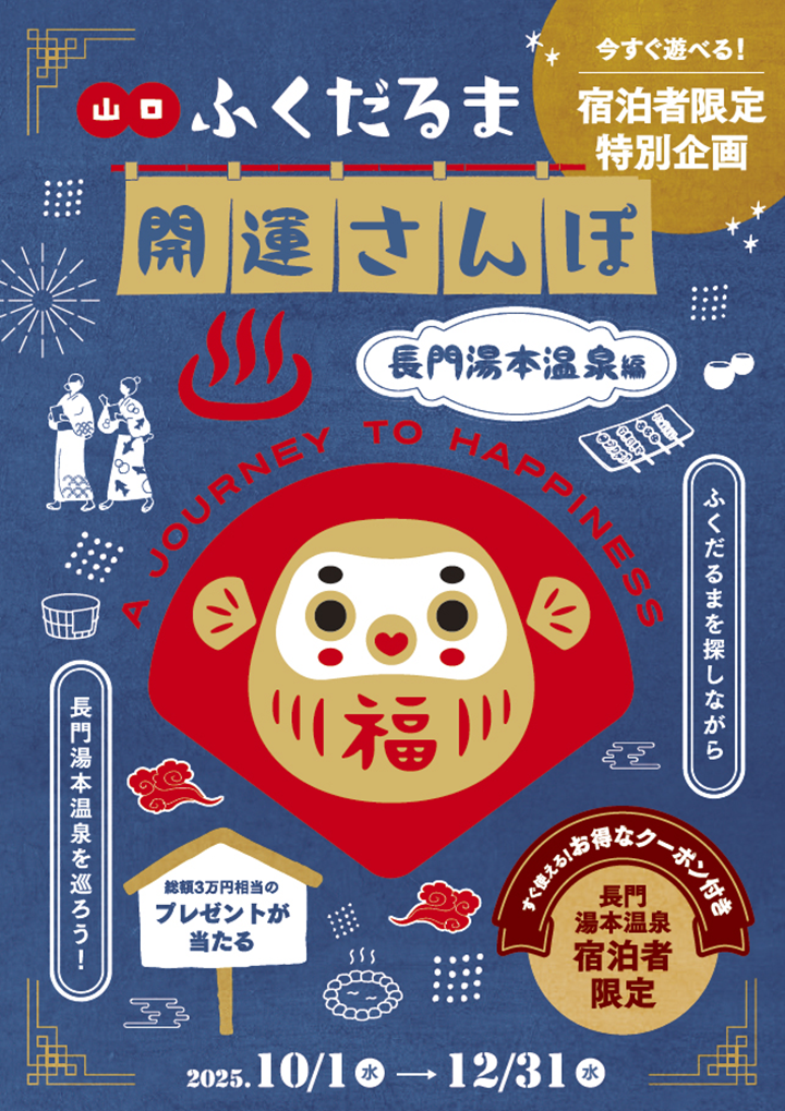 2025年10月1日~12月31日の期間、「山口ふくだるま開運さんぽ」長門湯本温泉編が開催されます。当キャンペーンは、2026年10月~12月に山口県で開催される「山口デスティネーションキャンペーン(DC)」のプレ企画の一つとなっています。対象冊子は、長門湯本温泉宿泊者限定でお配りしており、プレゼントへの応募企画や、温泉街でご利用いただけるデジタルクーポンが掲載されております。長門湯本での旅をお得に楽しくご利用いただけるこの機会に、ぜひお越しくださいませ。