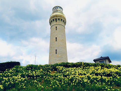角島灯台は、花崗岩で造られた白い灯台で、内部はらせん階段とはしごで登る造りになっており、展望部からは日本海と角島の様子を見渡すことができます。