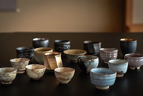 お土産処「山茶花」向かい「萩焼&金子みすゞコーナー」にて、深川萩作家の酒器を展示いたします。