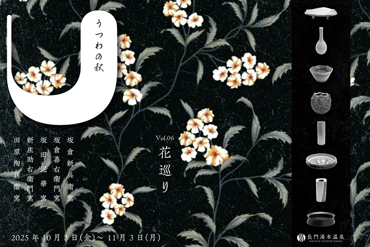 大谷山荘からほど近い三ノ瀬に息づく萩焼文化を温泉街で体験するイベント「うつわの秋」が開催されます。2020年に始まった本イベントは今年で6回目。テーマは「花巡り」として、花司/Flower Artist・田中孝幸氏をお招きした特別展示が、メイン会場の立ち寄り湯「恩湯」にて開催されます。サテライト会場には、当館を含む4つの会場が設けられ、それぞれ異なるうつわをご鑑賞いただけます。そして、今年からは、長門湯本温泉の中心に新たに誕生した地域拠点「まちの番台」も会場のひとつに加わりました。深川萩の魅力紹介など、より深く萩焼をお愉しみいただけます。期間中には、萩焼にまつわるポップアップ企画もございますので、野点や、深川萩で味わうクラフトビール、金継ぎ体験など、企画を通じて実際に触れて使ってみながら萩焼を身近に感じていただけますと幸いでございます。秋の温泉街をそぞろ歩きしながら、深川萩の魅力をゆっくりとご堪能くださいませ。