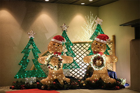 今年の大谷山荘ロビーのテーマは「ホワイトクリスマス」。ツリーには、真っ白な衣装を着たサンタクロースや、白で統一されたオーナメント、雪の結晶が飾り付けられ、その眩さに思わず目を奪われてしまいます。両脇にはサンタクロースの故郷・北欧の森にある白樺の灯りがやさしく煌めき、フロント周辺にもホワイトを主としたクリスマスモチーフが添えられています。 また、玄関では、ジンジャークッキーのライトアップやサンタクロースがお出迎え。「夢見るクリスマス」がテーマで、可愛らしい表情をした人形たちが賑やかに集まっています。夜が更け、あたりが暗くなりますと、一層イルミネーションの輝きが強くなり、昼間とは違った雰囲気をお愉しみいただけますので、ぜひ昼夜で異なる様子をご覧くださいませ。