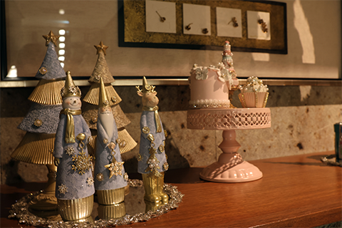 別邸音信宿泊者だけがご入館いただける館内を彩る今年のテーマは「森のクリスマス」。大人の余暇を愉しむ別邸音信では、大谷山荘とも異なるコーディネートが行われております。「The BAR OTOZURE」の前にあるツリーは、緑や金色を基調とし、花や葉など自然をモチーフにした模様や装飾で飾り付けられています。オーナメントのレース装飾は諸富氏自身で手掛けられており、緻密に作りこまれた美しさをお愉しみいただけます。フロント周辺では、妖精のようなサンタクロースの蝋燭飾りや、スイーツをモチーフにした飾りが添えられ、歩くたびに微笑みが溢れてきそうです。これから寒さ増す季節となりますが、あたたかな館内でゆっくりと、クリスマス飾りを探してみることをお愉しみの一つに加えるのはいかがでしょうか?皆様にとりまして素敵なクリスマスをお過ごしいただけますように。