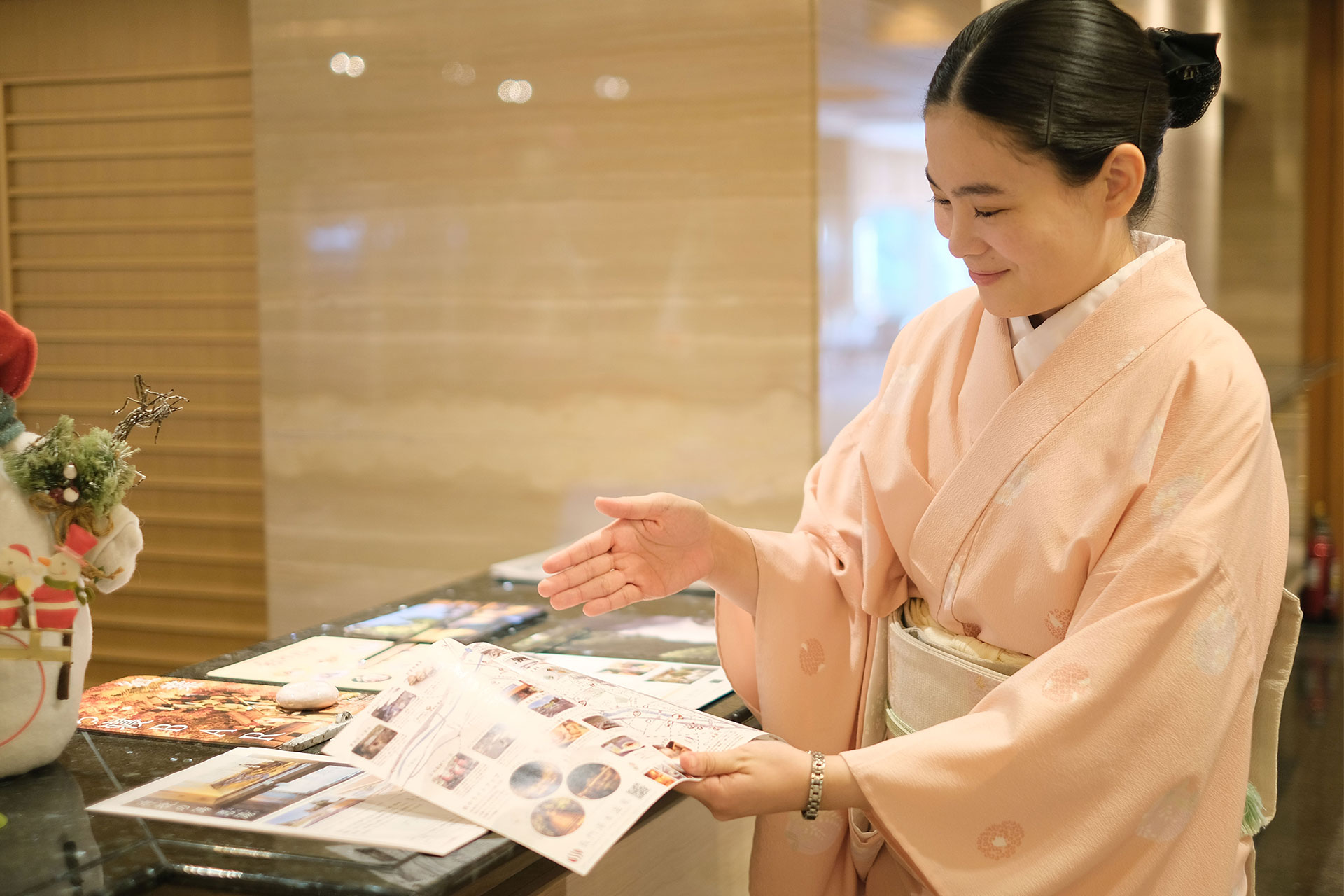 私が仕事をするうえで大切にしているのは、視野を広く持ち、状況を見て先回りして行動することです。例えば、周辺を見回されているお客様がいらっしゃる時には、フロントに来られるのを待つのではなく、自らお客様の方へ歩み寄ってお声掛けをし、ご用件を伺ったうえで目的の場所へご案内をします。一つひとつは小さな行動ですが、「お客様のお役に立ちたい」その気持ちの積み重ねが、安心感や満足感に繋がると考えております。